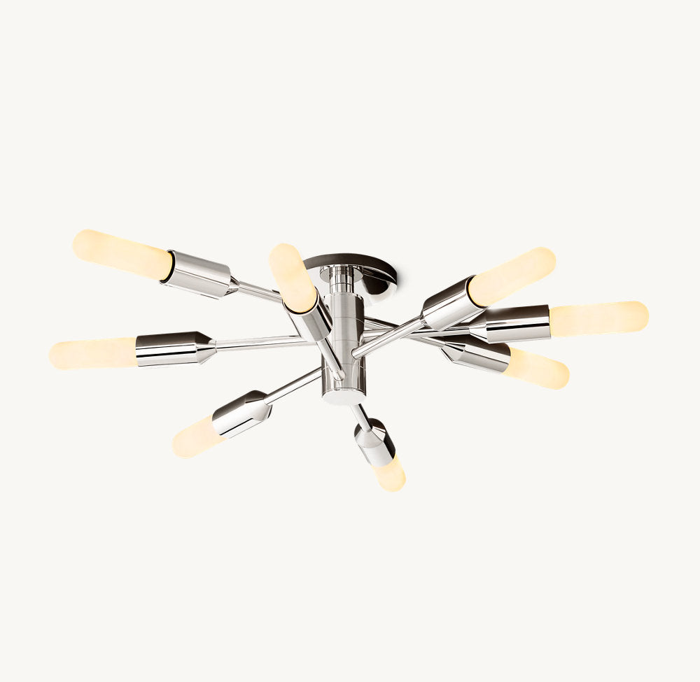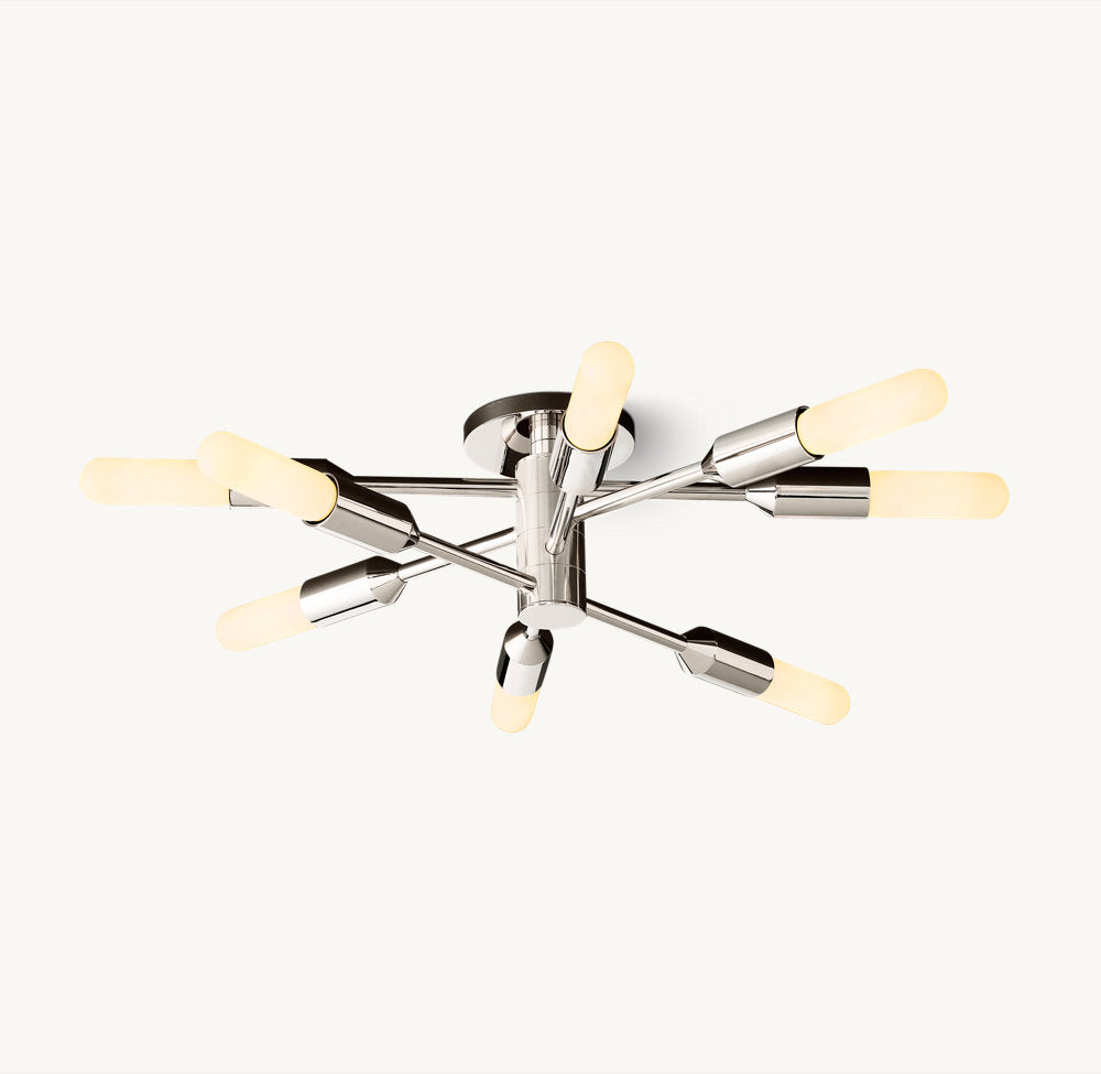 Inspired by 1950s Italian modernism, Dora's Arnaud collection resonates in its dichotomies. Kinetic energy is balanced with calming harmony, and simple elements combine in complex compositions. Arranged to create a fan effect, the arms are tilted in a perfect asymmetry. The overall effect is one of a sculpture in motion.