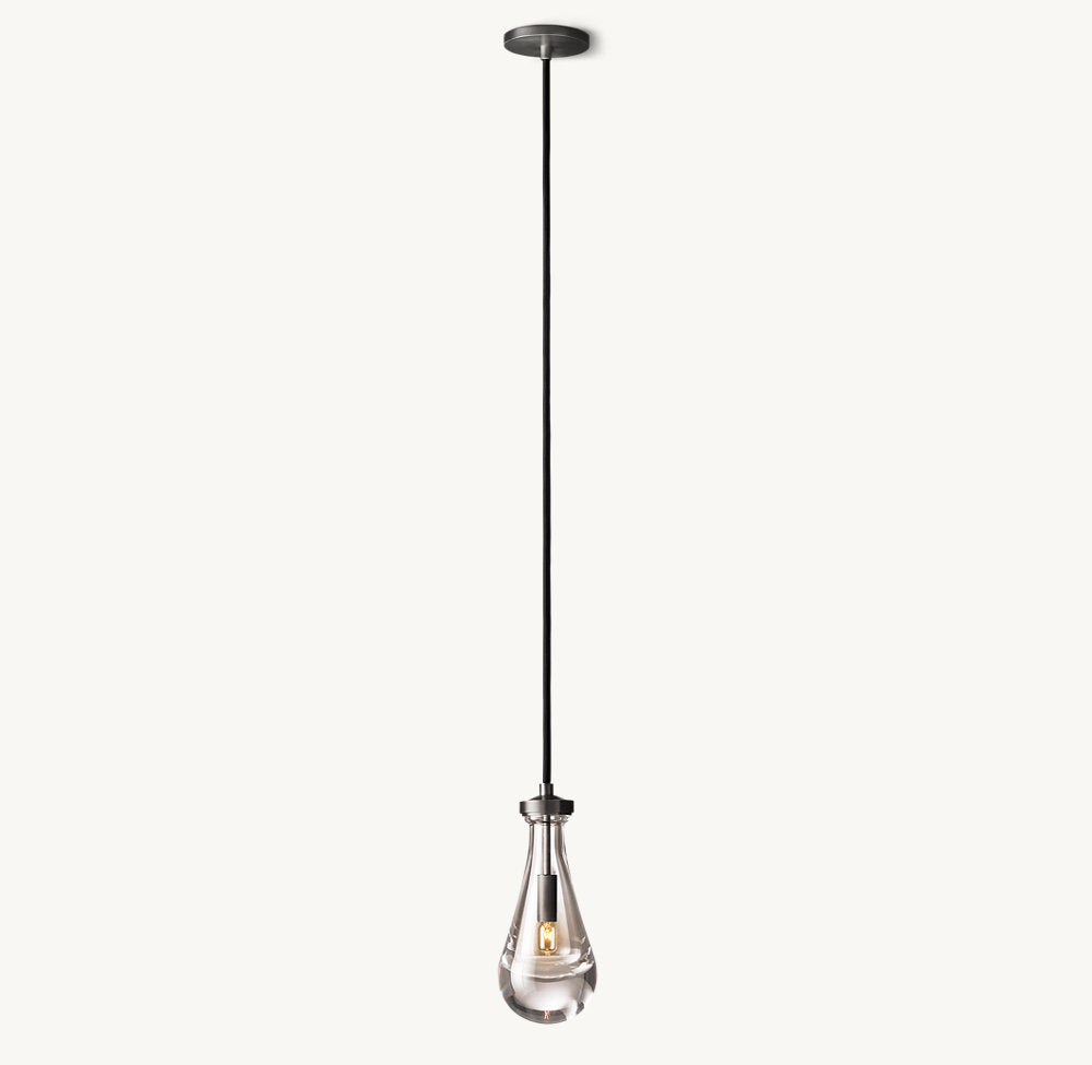 Master glass designer Dora has created a dramatic evocation of rain in this inspired collection. Suspended from a slim frame, a single drop of blown glass encases the bulb, casting a luminous glow.