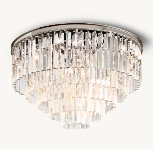 Inspired by the Art Deco style of 1920s Paris, our collection from Dora captures the period's fascination with geometric forms. Masterfully refracting the light, hundreds of faceted, dynamic prisms evoke the allure of the era. Hanging like lush fringe from a welded iron frame, the angular glass juxtaposes elegance and industrialism.