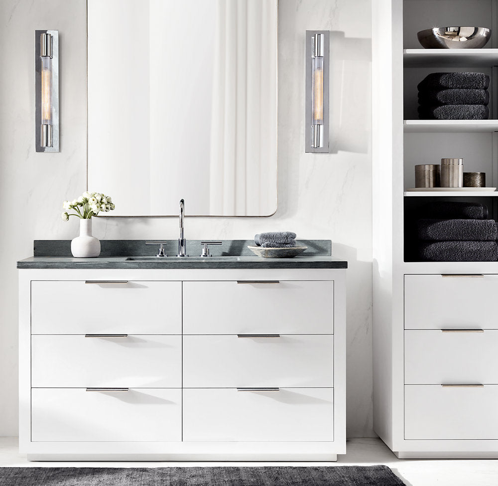 Inspired by Streamline Moderne architecture, Dora based this sconce on the smokestacks of London's Battersea Power Station. An elongated column of ribbed glass floats off the wall between two metal fittings. The sturdy backplate has chamfered edges and exposed screws, lending the fixture an industrial aesthetic.