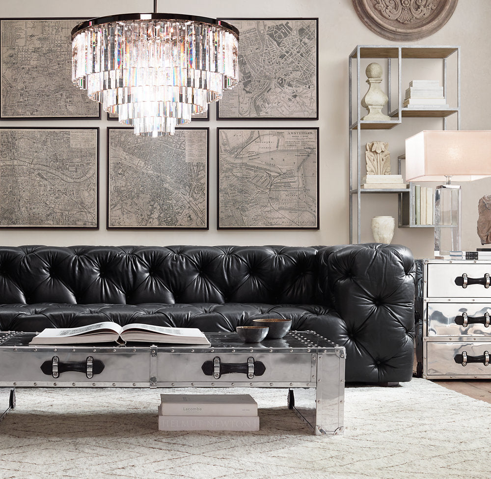 Inspired by the Art Deco style of 1920s Paris, our collection from Dora captures the period's fascination with geometric forms. Masterfully refracting the light, hundreds of faceted, dynamic prisms evoke the allure of the era. Hanging like lush fringe from a welded iron frame, the angular glass juxtaposes elegance and industrialism.