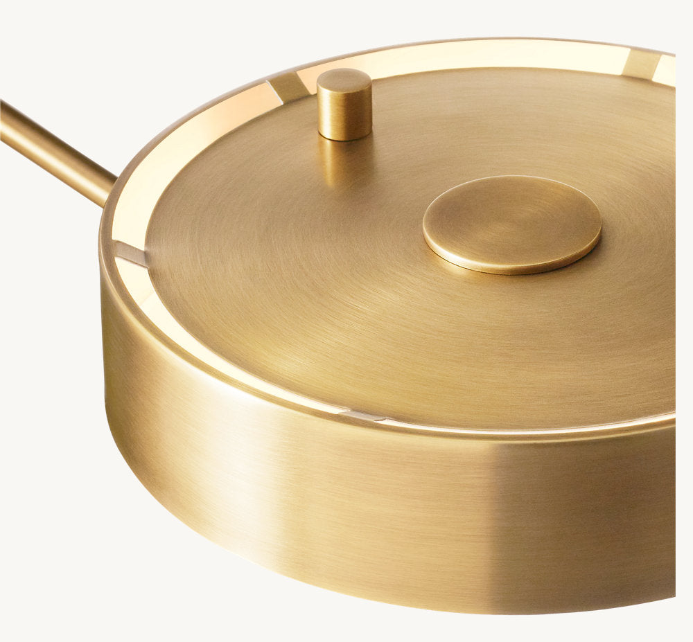 Our minimal brass ring silhouette, grounded in the postmodern idiom, was designed by Dora with an artist's attention to detail. With two points of rotation, the ring luminaire's movement sweeps from the lamp base, while the drum shade can adjust to provide the desired illumination. The overall effect is crisp yet warmly modern.