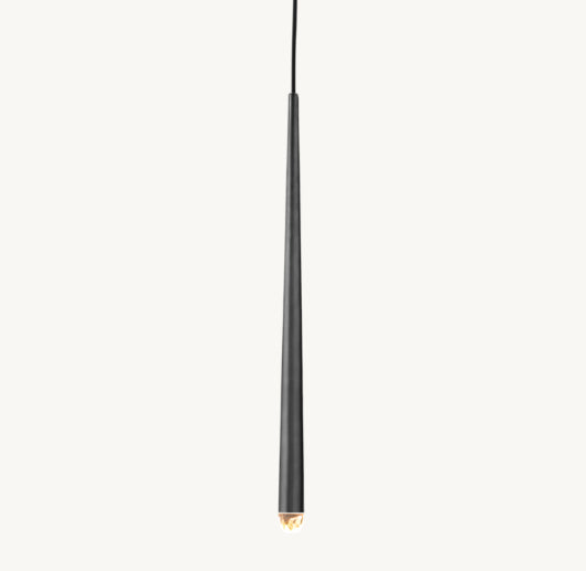 Inspired by French minimalist lighting of the 1960s, Dora's elegant design features a solid brass form suspended from a slender black cord. An inset LED at the tip offers warm, glowing light.