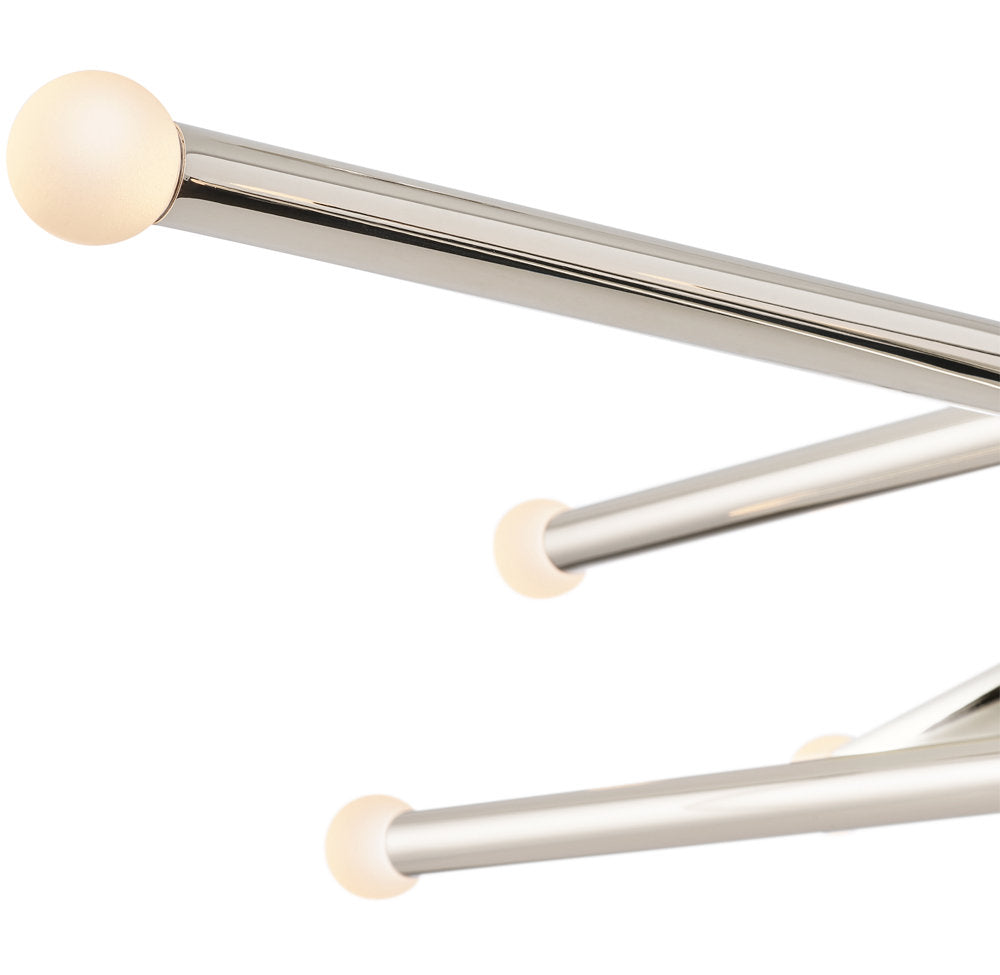 A contemporary interpretation of midcentury Italian design, Rousseau offers minimalist form in a striking silhouette. Each end of the chandelier's slender arms bears an etched glass shade with an integrated LED bulb, casting a warm, filtered glow.