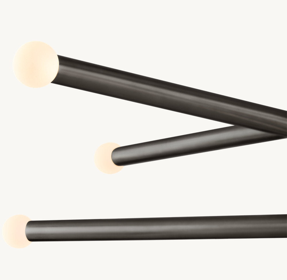 Inspired by minimalist midcentury Italian design, our contemporary interpretation of the chandelier offers reductionist form in a striking silhouette. Each end of Rousseau's slender arms bears an etched glass orb fitted with an integrated LED bulb. When lit, the fixture emits a warm, filtered glow.