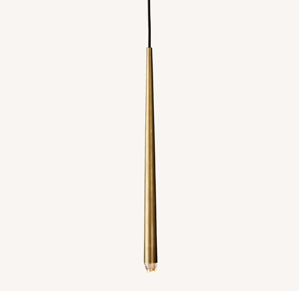 Inspired by French minimalist lighting of the 1960s, Dora's elegant design features a solid brass form suspended from a slender black cord. An inset LED at the tip offers warm, glowing light.