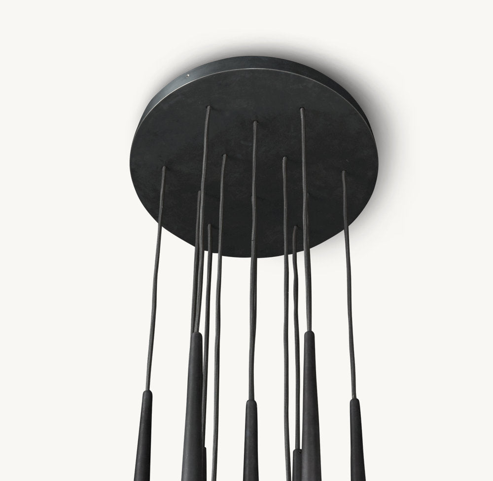 Inspired by French minimalist lighting of the 1960s, Dora's elegant design features a cluster of solid brass forms suspended from slender black cords. Inset LEDs at the faceted glass tips offer warm, glowing light.