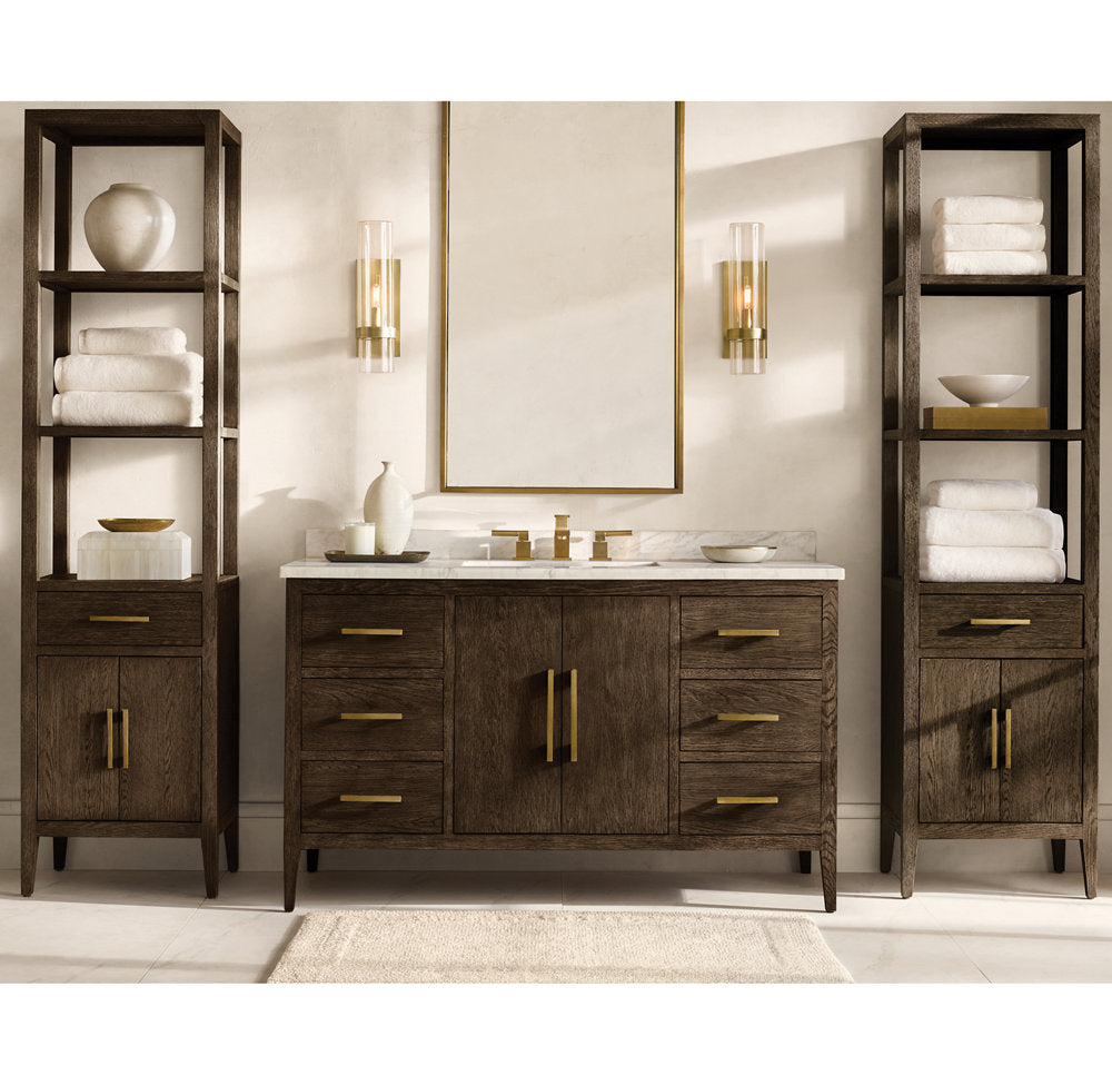 Art Deco forms are reimagined with a modern minimalist sensibility in this collection from renowned lighting designer Ian K. Fowler. Crafted of solid steel, unadorned metal bands hold the slender glass cylinders in place, in a state of perfect equipoise. Within each, Edison bulbs glow like flickering candles.