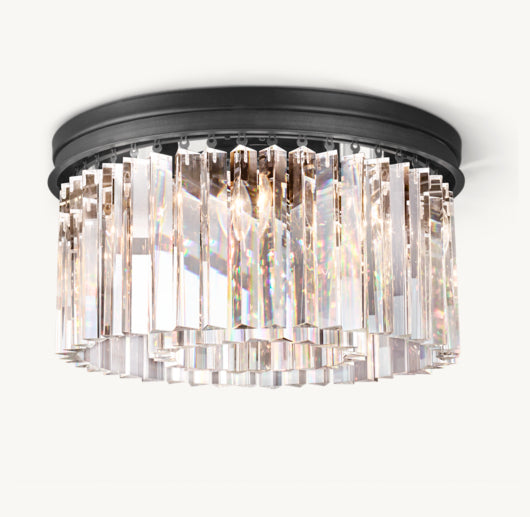 The Art Deco style born in 1920s Paris is evident in the straight-and-curved lines of our elegant lighting. Its optical-quality prisms, arranged in even, concentric rings, hang in sparkling harmony from an iron frame.