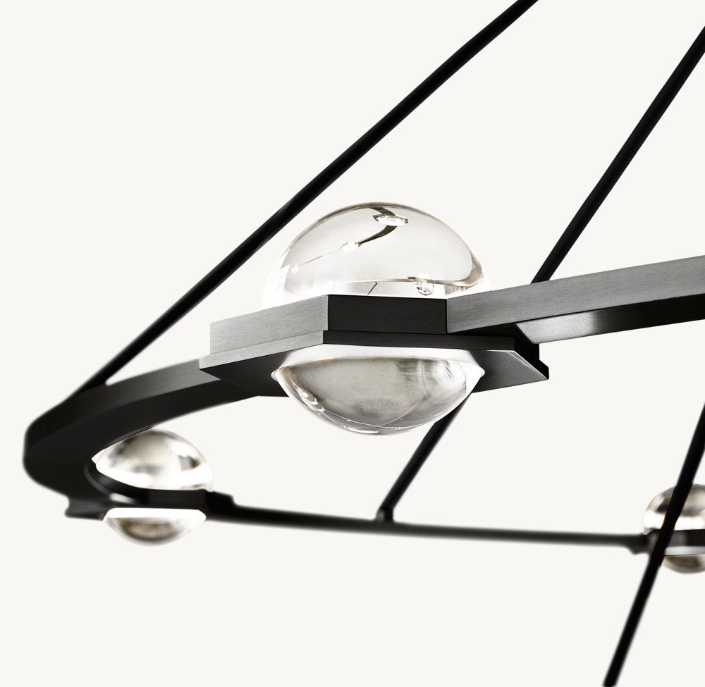 Spare and elemental, Dora's Éclatant collection features lighted crystal orbs, suspended in hexagonal fittings within a flat metal frame. The design was inspired by plans for the cenotaph of Sir Isaac Newton drawn by 18th-century architect Etienne Louis Boullée, a visionary ode to physics reinterpreted in a stunning contemporary form.