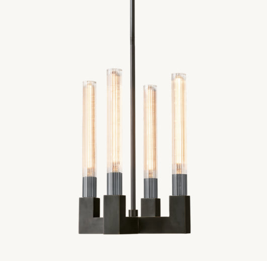 The form of a Beaux Arts chandelier is reinterpreted in solid brass by renowned lighting designer Dora. Defined by clean lines and sharp angles, the fixture's elegant ribbed-glass hurricanes showcase Edison filament bulbs, shimmering like candles within.