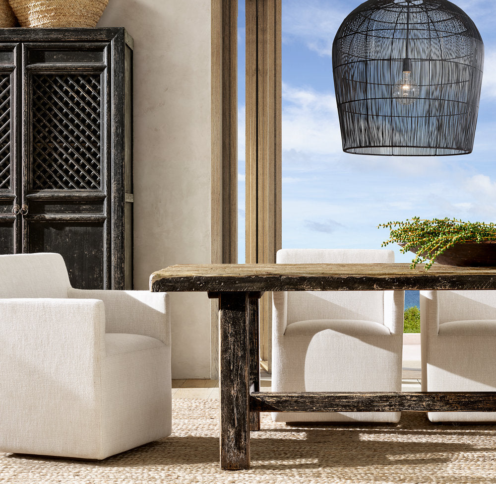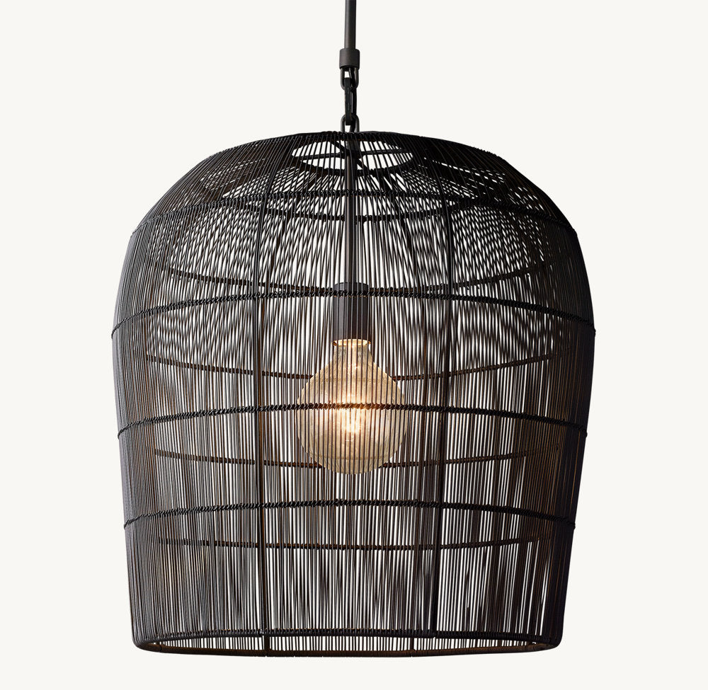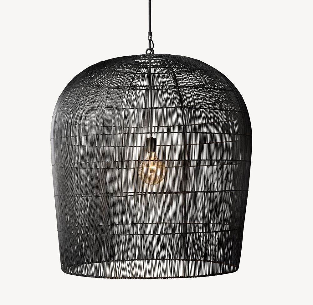 The classic industrial dome achieves new heights of drama with our grand-scale pendant. Narrow wires wrap vertically around a sculptural metal frame, which houses a single bulb within. Light filters through the linear weave, creating a play of shadows while casting an evocative glow.