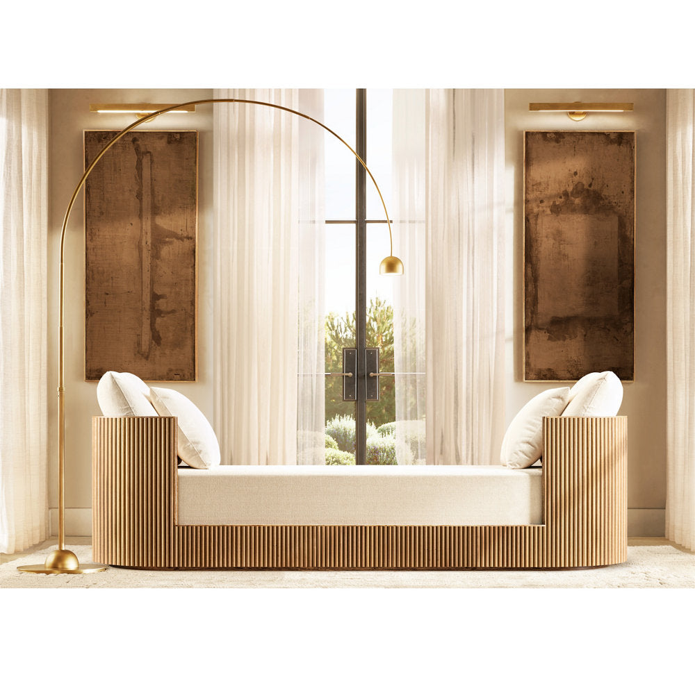 Inspired by the iconic Italian midcentury torchiere, Dora reimagines it for a new modern era. Minimal and more modest in scale, L'Arc is an elegant exploration of a dome's pure geometry, from the metal base and sleek arc of its arm to the shade balanced upon it.
