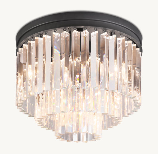 Inspired by the Art Deco style of 1920s Paris, our collection from Dora captures the period's fascination with geometric forms. Masterfully refracting the light, hundreds of faceted, dynamic prisms evoke the allure of the era. Hanging like lush fringe from a welded iron frame, the angular glass juxtaposes elegance and industrialism.