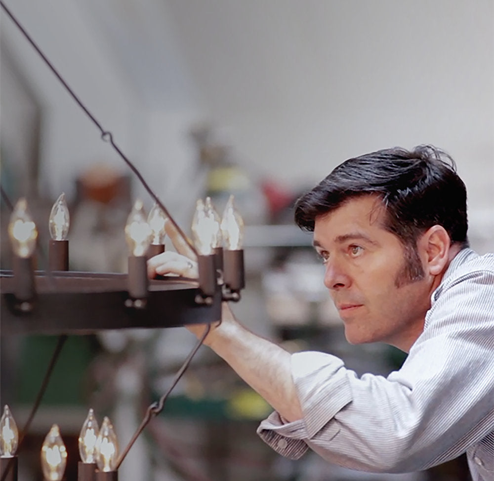 Rustic in style, simple in form and grandly sized, our hand-forged chandelier designed by industrial blacksmith Jon Sarriugarte makes an elegant statement. Drawing inspiration from early 20th century industrial fixtures, it's built of stout angle iron.